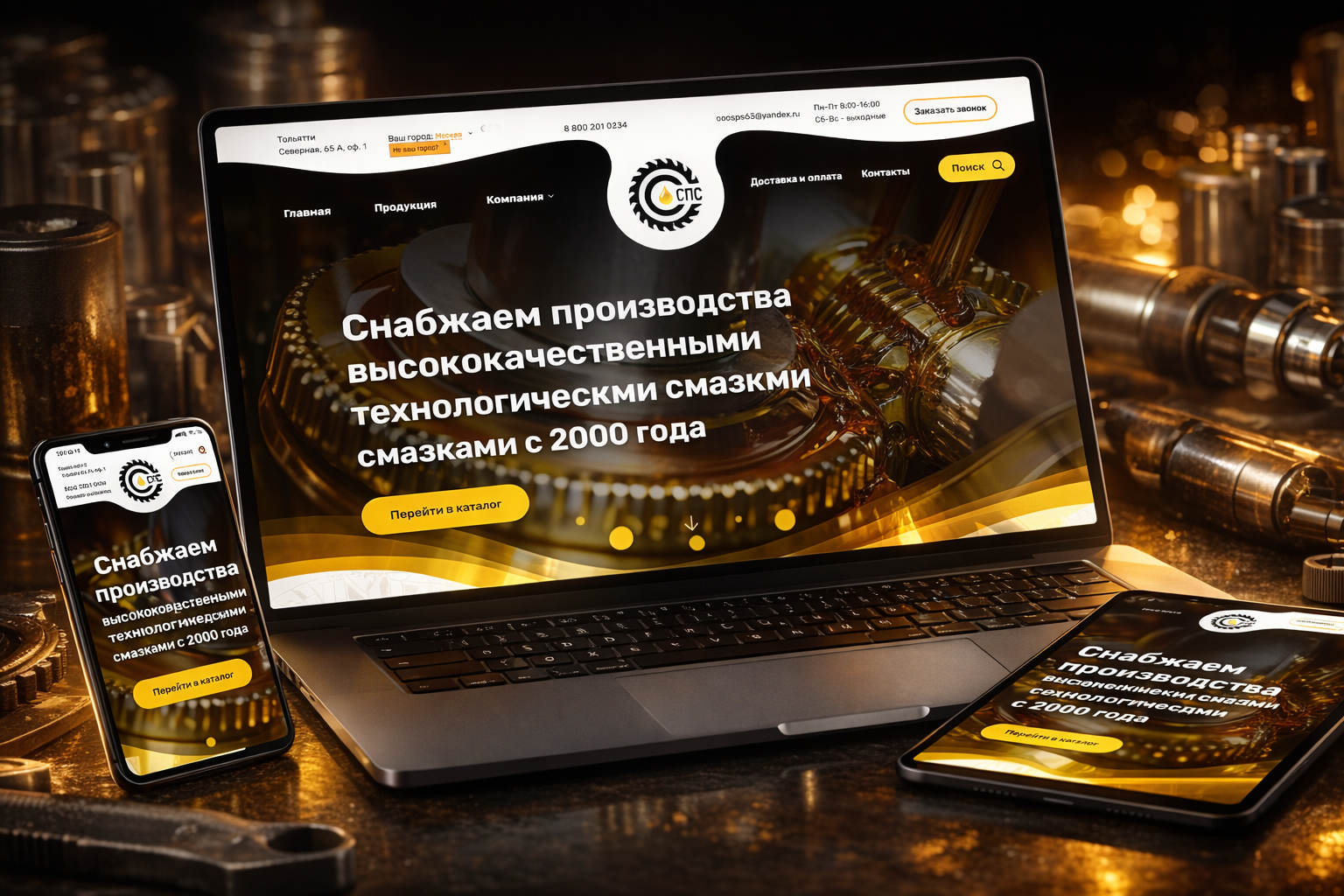 Золото масла растекается по изображению медленно и весомо, как аргумент, который не требует пояснений. Металл, шестерни, вязкая текстура смазки — визуал Ooosps.ru сразу задает индустриальный масштаб и ощущение серьезного производства. Лучшие сайты для интернет-магазинов по продаже технологических смазок продают уверенность в том, что ваш механизм будет работать без сбоев.