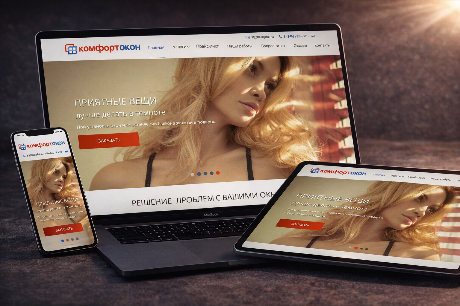 Свет льется сквозь ткань, кожа ловит теплый оттенок, тени ложатся мягко и управляемо — сайт Комфорт-окон.рф продает ощущение защищенного пространства: дом, где свет подчинен человеку, а не наоборот. Женский портрет работает как эмоциональный якорь — спокойствие, приватность, уверенность в выборе считываются быстрее любого текста. Лучшие сайты для интернет-магазинов окон обязаны продавать ощущение тишины, мягкого света и уюта.