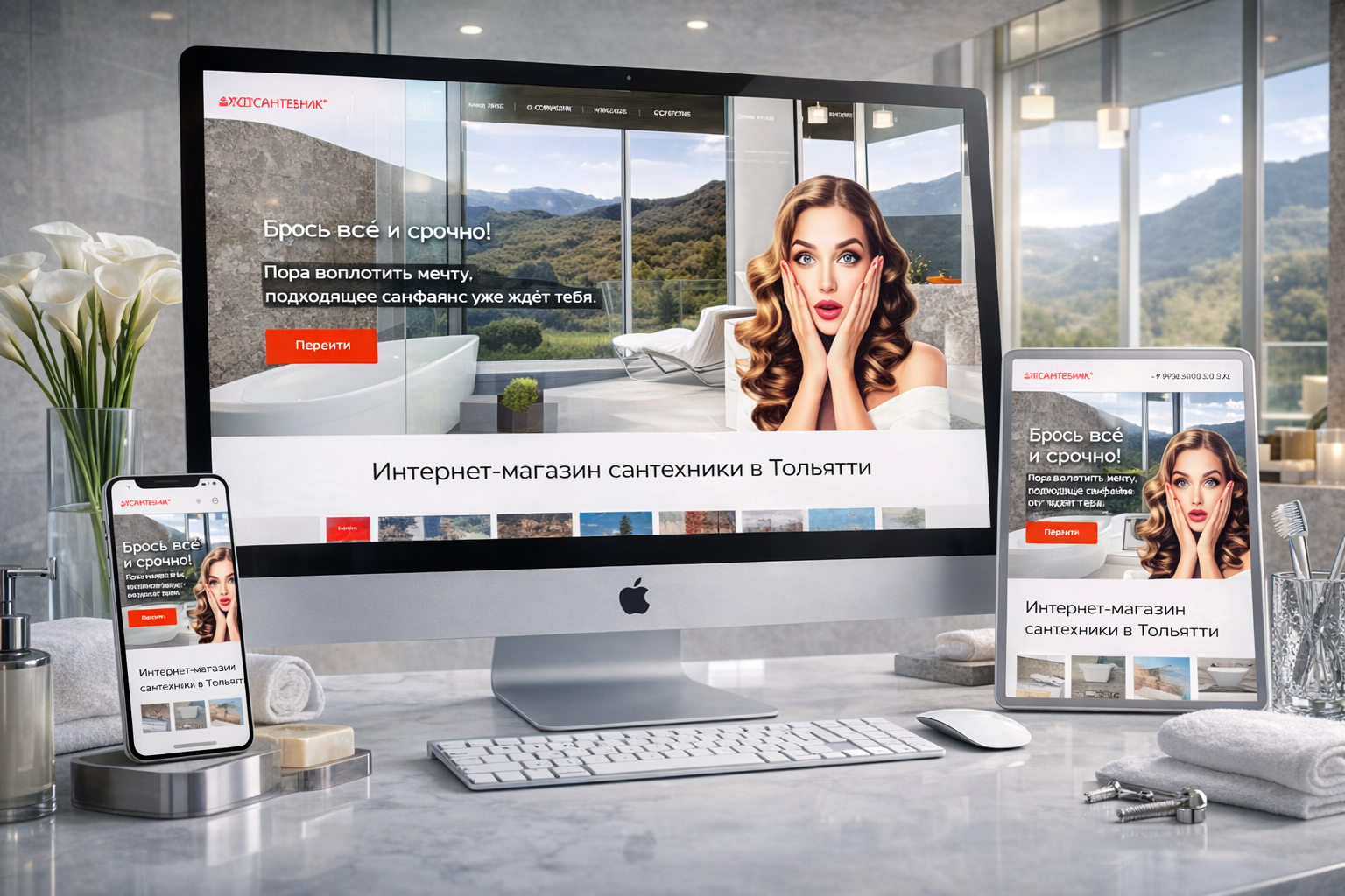 Белоснежное пространство ванной разворачивается как сцена из дизайнерского каталога, а женский образ с удивленным взглядом добавляет эмоцию неожиданного открытия: сантехника внезапно перестает быть скучной. Веб-дизайн Komtsumir.ru работает на эффект «вау» — чистота линий, панорамные окна, горный пейзаж и глянец поверхностей формируют ощущение премиального выбора, где функциональность встречается с эстетикой. Потому что лучшие сайты для интернет-магазинов сантехники обязаны продавать не трубы и смесители, а ощущение идеального пространства.