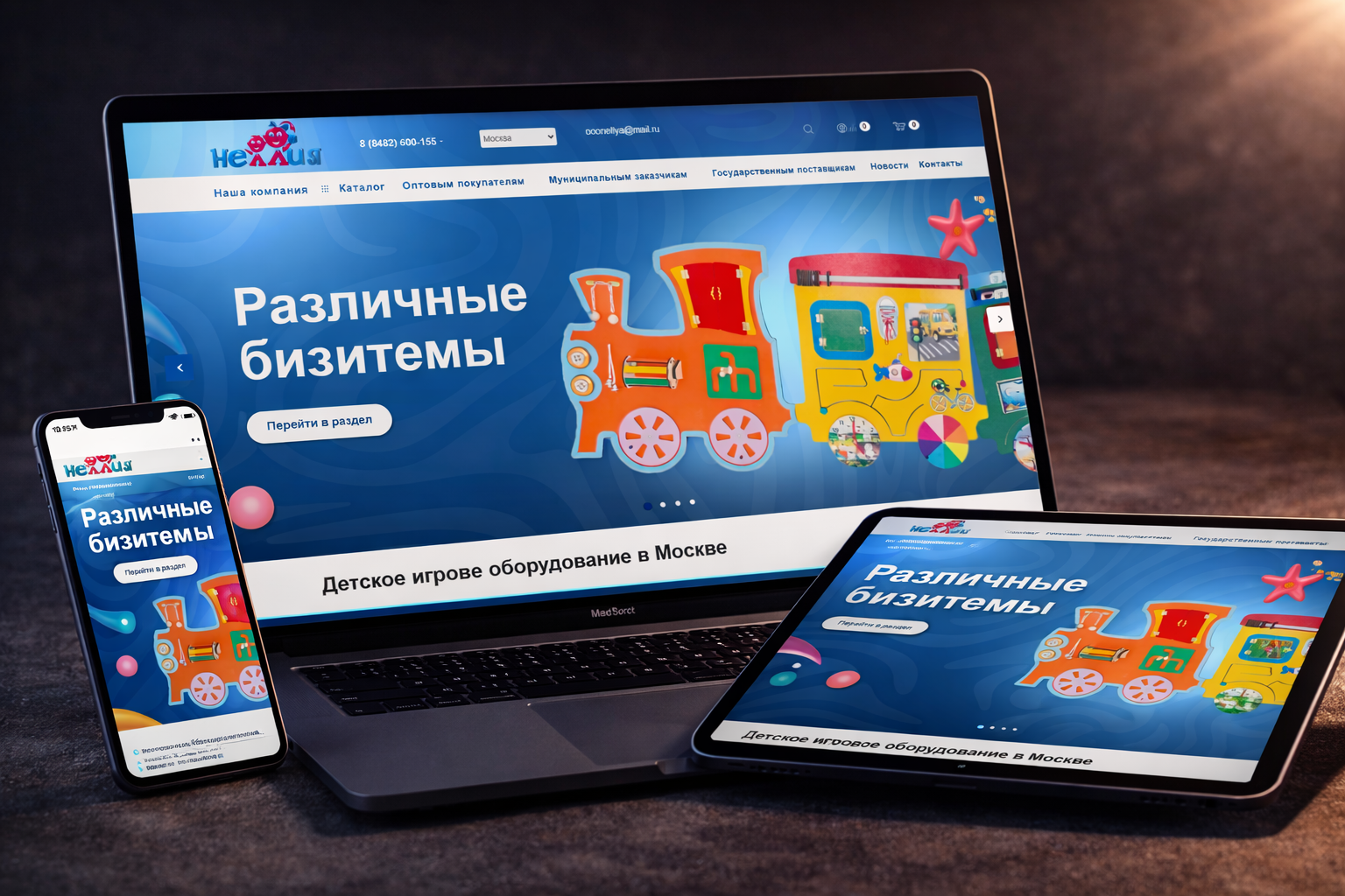 Цвета для детей играют громче слов: сочный синий фон, мультяшный поезд, формы без острых углов — изображение сразу переключает мышление во взрослого на режим «детская логика». Визуал лучшего сайта для продажи игрового оборудования Nellya.ru предлагает радость, движение и безопасность одновременно. Экран компьютера работает как приглашение в игровое пространство, где все уже продумано за родителей и заказчиков детских площадок.